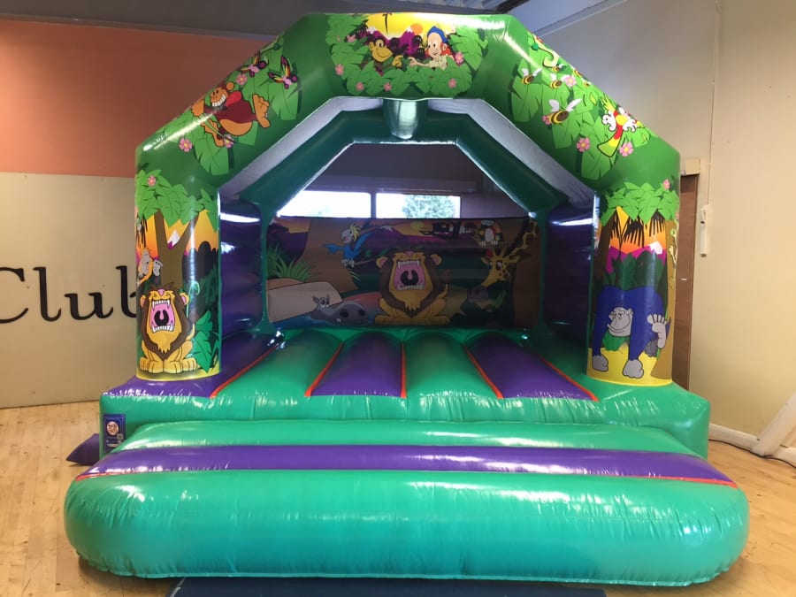 Embark on a fun-filled journey with our vibrant Jungle Bouncy Castle! Go wild for this amazing inflatable - it's perfect for children's parties, and a favourite in Harlow and surrounding areas of London, Essex and Hertfordshire. Its lively green and purple hues, adorned with friendly cartoon lions, monkeys, and an array of jungle creatures, bring a safari adventure right to your back garden - in bouncy castle form!