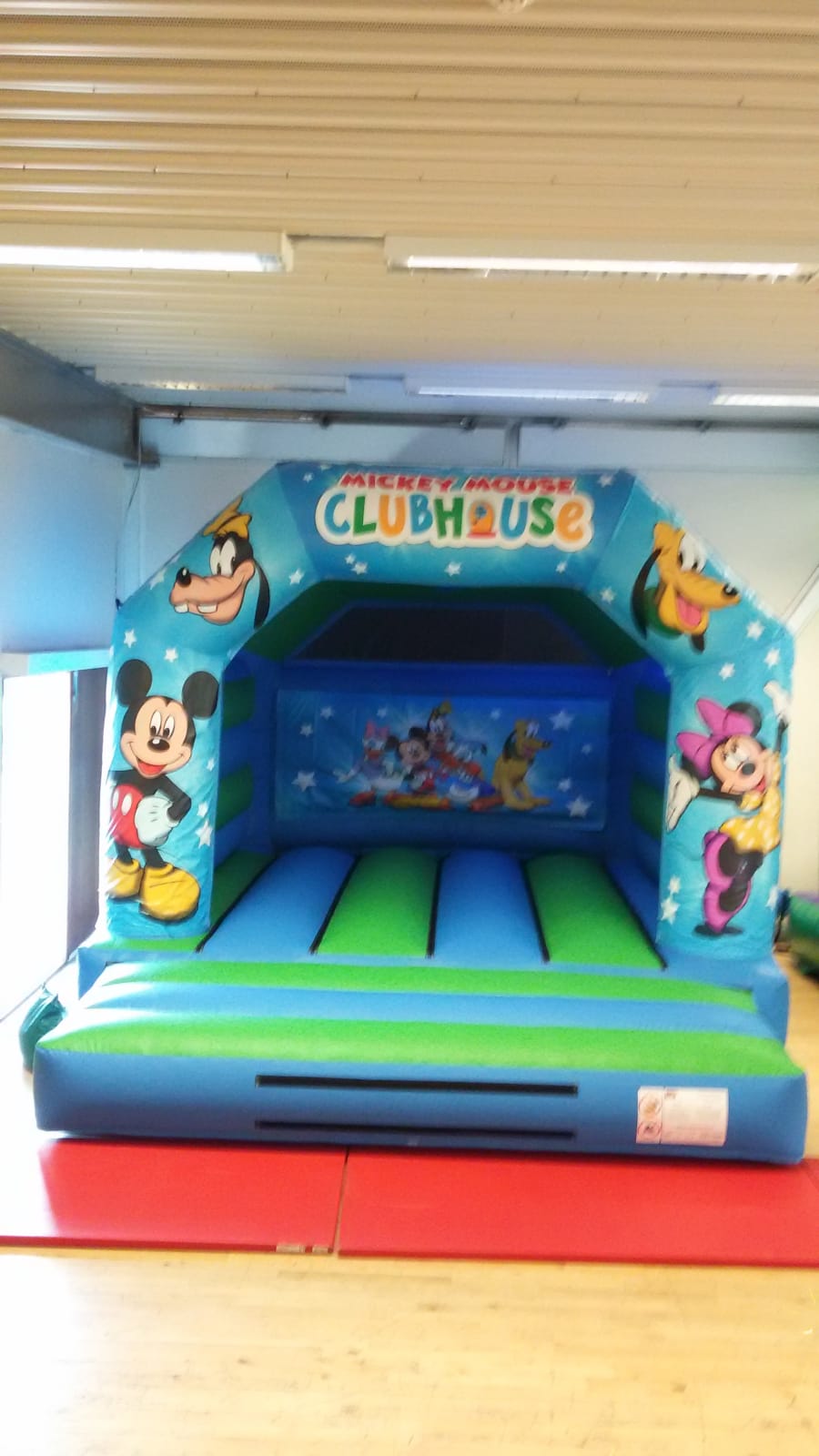 Welcome to the fun and whimsical world of our Mickey's Cub House Bouncy Castle, a hit at both adult and children's parties across London and Hertfordshire. This bouncy castle, themed around the beloved Mickey Mouse, is sure to bring smiles and laughter to your event. The front panel artwork is removable. This means you can opt for a simpler, plain blue and green booking system if it better suits the theme of your party.